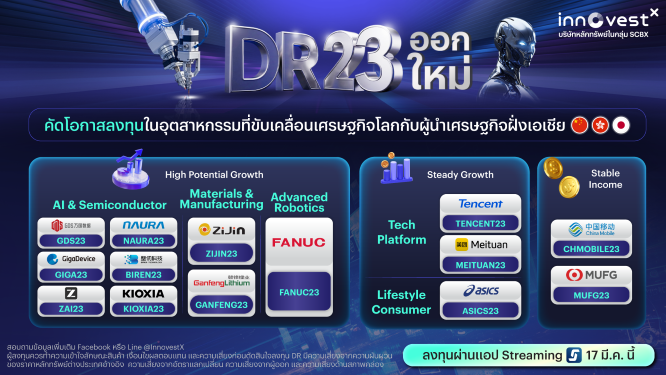 ตลาดหลักทรัพย์แห่งประเทศไทย รับจดทะเบียนตราสารแสดงสิทธิในหลักทรัพย์ต่างประเทศ (DR) 14 หลักทรัพย์ใหม่ อ้างอิงหุ้นชั้นนำในตลาดหลักทรัพย์เซินเจิ้น (SZSE) ตลาดหลักทรัพย์ฮ่องกง (HKEX) และตลาดหลักทรัพย์โตเกียว (TSE) ออกโดย บริษัทหลักทรัพย์ อินโนเวสท์ เอกซ์ จำกัด (INVX) เริ่มซื้อขายในตลาดหลักทรัพย์ไทย 17 มีนาคม 2569