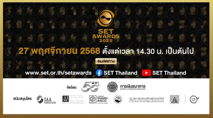 ตลาดหลักทรัพย์แห่งประเทศไทย เชิญรับชมการถ่ายทอดสดพิธีประกาศผลและมอบรางวัล SET Awards 2025 เพื่อประกาศเกียรติคุณและมอบรางวัลให้แก่ บริษัทจดทะเบียน บริษัทหลักทรัพย์ บริษัทหลักทรัพย์จัดการกองทุน บริษัทที่ปรึกษาทางการเงิน ทรัสต์เพื่อการลงทุนในอสังหาริมทรัพย์ และผู้บริหารระดับสูงของบริษัทจดทะเบียน ที่มีความเป็นเลิศในด้านต่างๆ