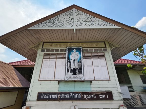 นั่งเรือต่อมายังท่าน้ำเมืองปทุมธานี จุดนี้เราจะได้เห็นกลุ่มอาคารประวัติศาสตร์สไตล์ตะวันตกสมัยรัชกาลที่ 6 ที่ได้รับการอนุรักษ์ไว้อย่างดีเยี่ยม ทั้งศาลากลางจังหวัดหลังเก่าและสำนักงานประถมฯ สถาปัตยกรรมที่นี่ดูสวยคลาสสิก ถ่ายรูปมุมไหนก็สวยเหมือนย้อนยุคเลยครับ