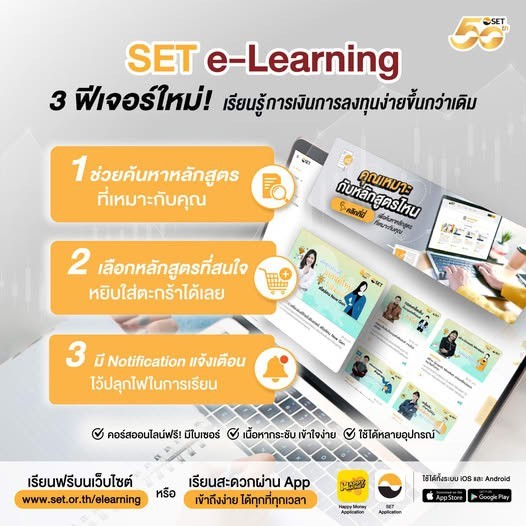 คนที่สนใจเรื่องลงทุน อยากศึกษา หรือ อัพเดทความรู้เพิ่มเติม สามารถเรียนได้สะดวกทุกที่ทุกเวลา โดยเราสามารถเรียนหลักสูตร SET e-Learning บนอุปกรณ์ต่างๆ ได้หลากหลาย รองรับทั้งมือถือ , โน้ตบุ๊ค หรือ คอมพิวเตอร์พีซี ผู้สนใจสามารถคลิกเข้าเรียนบนเว็บไซต์ www.set.or.th/elearning หรือผ่านแอป Happy Money ที่มีให้ดาวน์โหลดฟรีทั้งระบบ iOS และ Android เพียงค้นหาคำว่า SET HAPPY MONEY