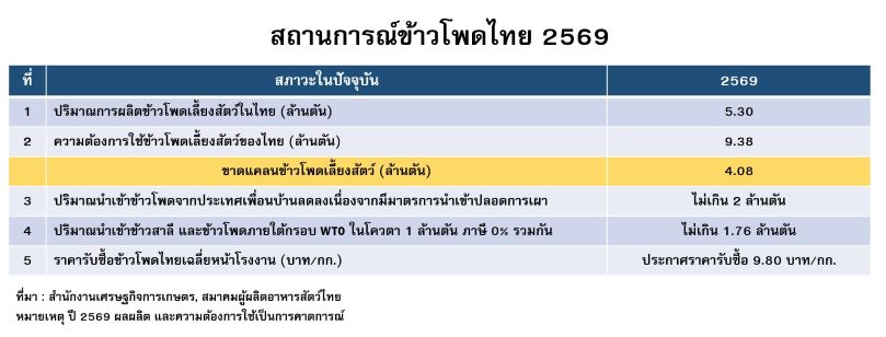 ประเทศไทยมีความต้องการใช้ข้าวโพดเลี้ยงสัตว์ปีละกว่า 9 ล้านตัน ผลผลิตข้าวโพดในประเทศไทยมีเพียง 4.5-5 ล้านตัน ทำให้ที่ผ่านมาต้องนำเข้าข้าวโพดเลี้ยงสัตว์จากประเทศเพื่อนบ้านเฉลี่ยปีละ 1.5-2.0 ล้านตัน นำเข้าข้าวสาลีเฉลี่ย ปีละ 1.5-1.6 ล้านตัน เมื่อนำตัวเลขทั้งสองส่วนมาบวกกันแล้ว ถือว่าประเทศไทยยังขาดแคลนข้าวโพดอีกจำนวน 0.4-1.0 ล้านตันต่อปี
