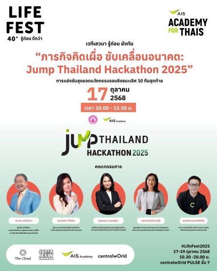 ขอเชิญชวนทุกท่านมาร่วมเชียร์และเป็นกำลังใจให้กับน้อง ๆ นิสิต นักศึกษา 10 ทีมสุดท้ายของโครงการ JUMP THAILAND Hackathon 2025 ในงาน AIS ACADEMY for THAIs at LIFE FEST 40+ วันศุกร์ที่ 17 ตุลาคม 2568 เวลา 10.00 – 14.00 น. ณ @centralwOrld PULSE ชั้น 7 ผู้สนใจสามารถลงทะเบียนเข้าร่วมงานฟรี ดูรายละเอียดเพิ่มเติมที่เพจ AIS Academy