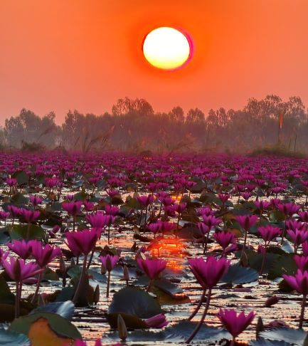 ล่องเรือสัมผัสบัวแดงบาน สวยละลานตาที่ทุ่งบัวแดงบ้านรางบัว