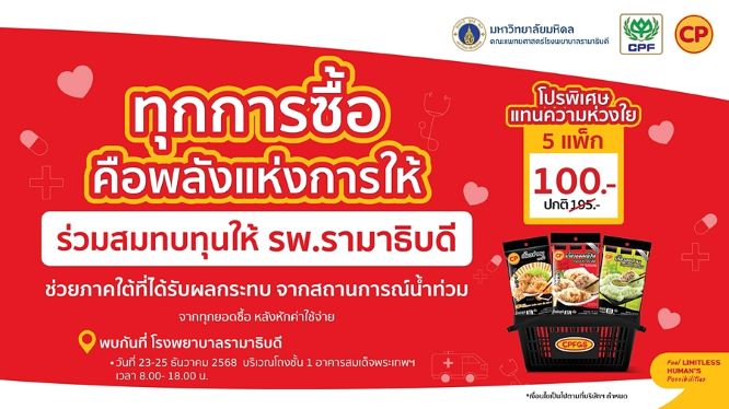 จากเหตุการณ์อุทกภัยในพื้นที่ภาคใต้ที่สร้างผลกระทบต่อประชาชนอย่างกว้างขวาง บริษัท เจริญโภคภัณฑ์อาหาร จำกัด (มหาชน) หรือซีพีเอฟ ร่วมกับ โรงพยาบาลรามาธิบดี เดินหน้า โครงการ “ทุกการซื้อ คือพลังแห่งการให้” เพื่อร่วมเป็นส่วนหนึ่งในการบรรเทาทุกข์และฟื้นฟูพื้นที่ที่ได้รับผลกระทบ สานต่อภารกิจแห่งการช่วยเหลือสังคม โดยรายได้จากการจำหน่ายผลิตภัณฑ์อาหารภายในงานหลังหักค่าใช้จ่าย จะนำไปสมทบทุนเพื่อช่วยเหลือและฟื้นฟูพื้นที่ภาคใต้ รวมถึงสนับสนุนอุปกรณ์ทางการแพทย์และงานสาธารณสุขในพื้นที่ที่จำเป็นเร่งด่วน
