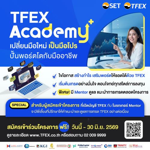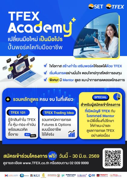 บมจ. ตลาดสัญญาซื้อขายล่วงหน้า (ประเทศไทย) (TFEX) ชวนผู้สนใจเข้าร่วมโครงการ TFEX Academy+ เรียนรู้การใช้ Futures และ Options เป็นเครื่องมือเสริมพอร์ต ที่ตอบโจทย์ทุกสไตล์ลงทุน และใช้ได้ทุกสภาวะตลาด ไม่ว่าจะเป็นการใช้ทำกำไรช่วงที่ตลาดมีแนวโน้มชัดเจน ใช้ป้องกันความเสี่ยงจากสินทรัพย์ที่ลงทุน อาทิ ดัชนีหุ้น หุ้นรายตัว ทองคำ โลหะเงิน อัตราแลกเปลี่ยน ยางพารา ฯลฯ หรือเป็นทางเลือกในการกระจายการลงทุนรับมือกับทุกจังหวะความผันผวน มือใหม่ก็เริ่มต้นได้ เพราะรวมหลักสูตรเนื้อหาตั้งแต่พื้นฐาน ไปจนถึงเทคนิคและกลยุทธ์ที่ใช้เทรดได้จริงกว่า 50 คอร์ส โดยวิทยากรรับเชิญและเทรดเดอร์มืออาชีพ ผ่านระบบออนไลน์และออฟไลน์ เรียนรู้จากที่ไหนก็ได้และสามารถเลือกหัวข้อได้ตามความสนใจ พร้อมมีโบรกเกอร์ Mentor ชั้นนำ 11 แห่ง มาดูแลให้คำปรึกษาตลอดโครงการ เพื่อให้คุณเริ่มต้นเทรดได้อย่างมั่นใจ สมัครฟรี! ตั้งแต่วันนี้ -30 มิ.ย. 2569 สอบถามเพิ่มเติมโทร 0 2009 9999 สมัครก่อนได้เรียนก่อน ที่ https://www.tfex.co.th/th/activities/tfexacademyplus2026